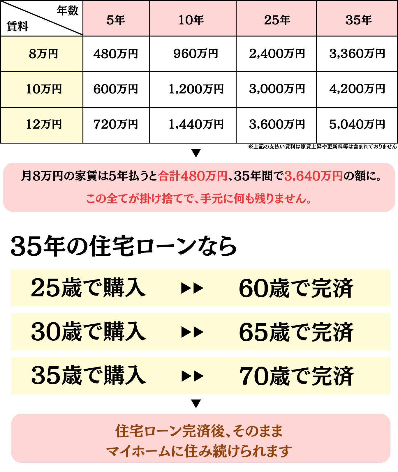 賃貸に住み続けると、毎月の家賃は必要経費として消えていきます。