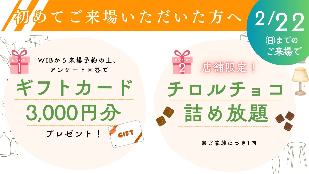 ❶前日予約+事前アンケートへご回答の方で店舗にて資金相談までされた方にギフトカード3000円をプレゼントさせていただきます(予約受付は営業日前日の17時までとなります)。❷事前の電話連絡にご対応の上、来場特典のお渡し条件をご理解頂いた方 ❸既に他社様にて契約をされている方、家づくりの検討のない方は対象外となります。❹ご夫婦または、ご家族揃っての来場が対象となります。❺過去来場されてから3ヶ月以上経っている方 ❻ご本人確認(運転免許証、マイナンバーカード等)を提示できる方 ・年収400万円以上の方(ご夫婦連帯での返済希望の方は合算で450万円以上で可) ❼3000万円以上のお借入が可能な方、又は自己資金が物件価格の20%以上ある方(自己資金のご提示を頂きます) ❽ご年収の確認(源泉徴収票、給与明細の直近3ヶ月以上分)をご提示できる方❾(外国籍の方で)在留カード(永住資格を確認できる書類)のご提示をいただける方。ご来場者 (ご予約者)の内どなたかが永住権をお持ちの方がいらっしゃれば本キャンペーンの対象とさせていただきます。 ❿他イベントやキャンペーンの来場特典との併用は不可となります。 ⓫特典の進呈数に限りがあるため、なくなり次第終了となります。 ⓬ギフト・プレゼントは1家族1回限りとなります。⓭来場特典は2月8日までにご来場の方に限ります。⓮上記①〜⑬に該当の場合でも、弊社判断にて特典をお渡しできないと判断する場合もあります。ご了承よろしくお願いします。