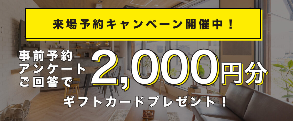 ❶前日予約+事前アンケートへご回答の方で店舗にて資金相談までされた方にギフトカード2000円をプレゼントさせていただきます(予約受付は営業日前日の17時までとなります)。❷事前の電話連絡にご対応の上、来場特典のお渡し条件をご理解頂いた方 ❸既に他社様にて契約をされている方、家づくりの検討のない方は対象外となります。❹ご夫婦または、ご家族揃っての来場が対象となります。❺過去来場されてから3ヶ月以上経っている方 ❻ご本人確認(運転免許証、マイナンバーカード等)を提示できる方 ・年収400万円以上の方(ご夫婦連帯での返済希望の方は合算で450万円以上で可) ❼3000万円以上のお借入が可能な方、又は自己資金が物件価格の20%以上ある方(自己資金のご提示を頂きます) ❽ご年収の確認(源泉徴収票、給与明細の直近3ヶ月以上分)をご提示できる方❾(外国籍の方で)在留カード(永住資格を確認できる書類)のご提示をいただける方。ご来場者 (ご予約者)の内どなたかが永住権をお持ちの方がいらっしゃれば本キャンペーンの対象とさせていただきます。 ❿他イベントやキャンペーンの来場特典との併用は不可となります。 ⓫特典の進呈数に限りがあるため、なくなり次第終了となります。 ⓬ギフト・プレゼントは1家族1回限りとなります。⓭来場特典は4月26日までにご来場の方に限ります。⓮上記①〜⑬に該当の場合でも、弊社判断にて特典をお渡しできないと判断する場合もあります。ご了承よろしくお願いします。