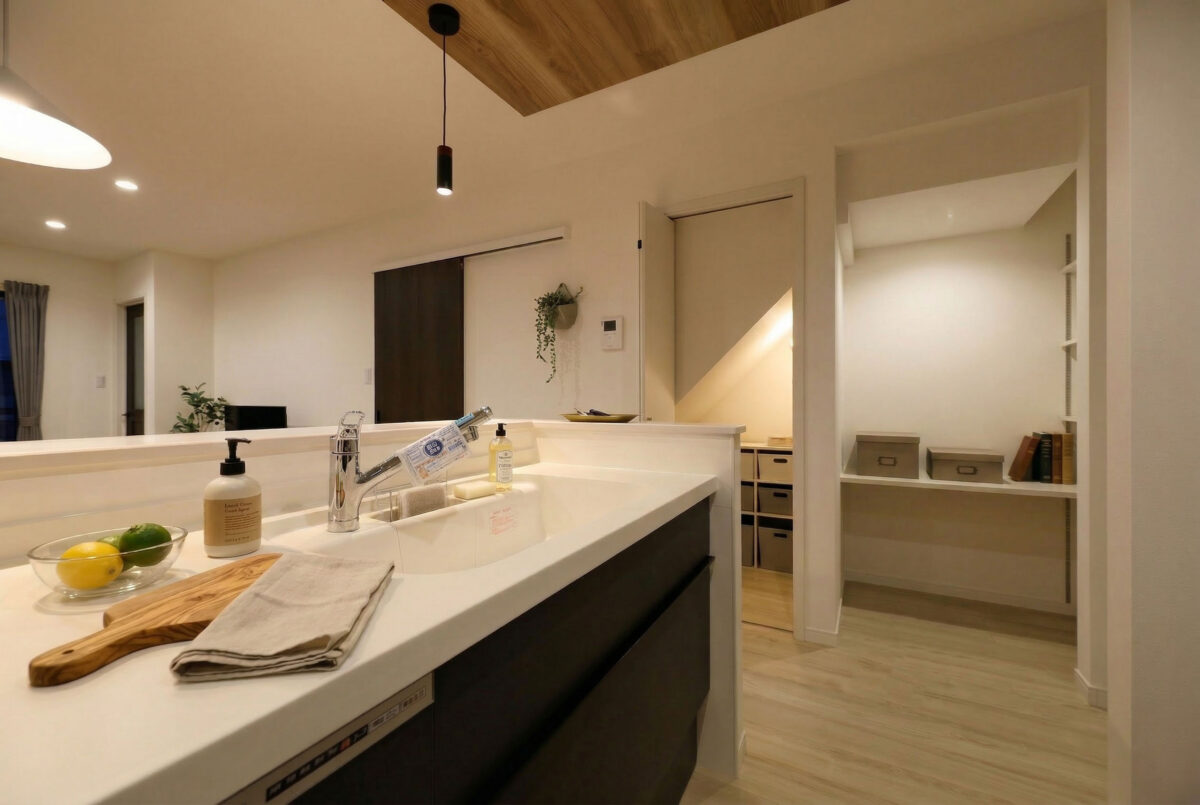 パントリーで収納力アップ。買い置きも整理もラクになり、キッチンがスッキリ快適に。調理もスムーズで時短になります。