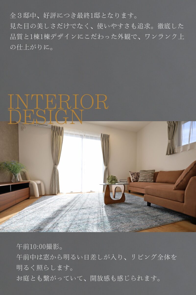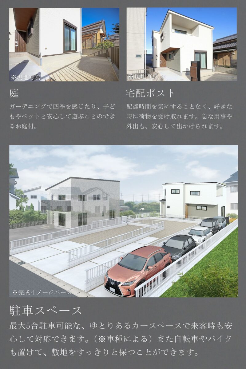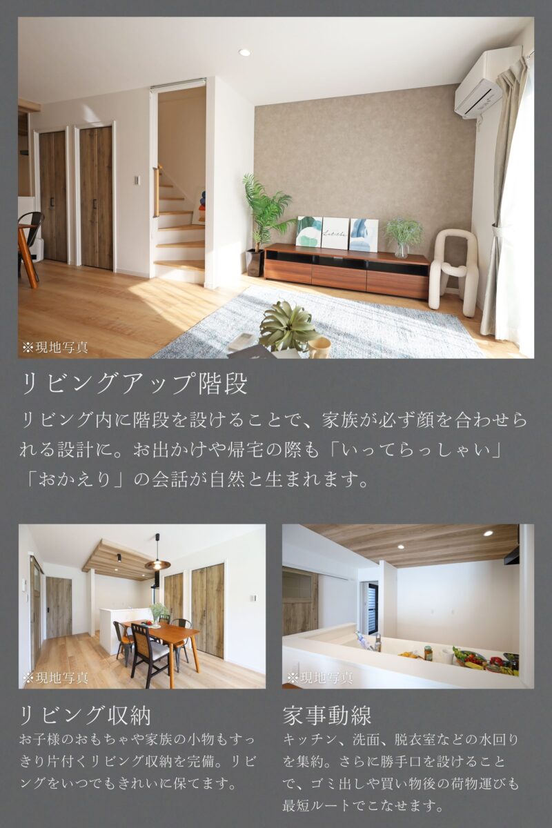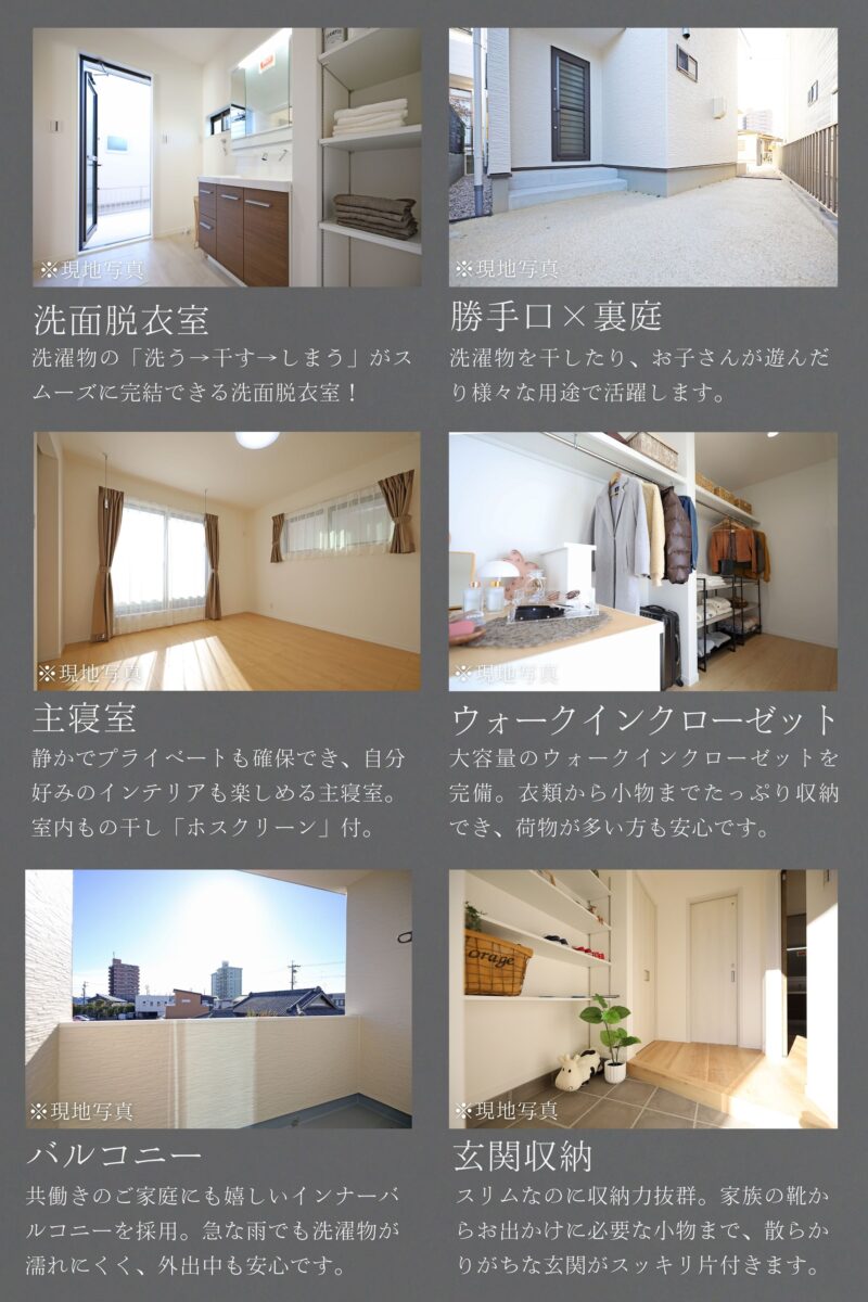 | 設備仕様 | 上水道 下水道 電気 都市ガス TVモニター付きインターフォン 人感センサー付照明(玄関、廊下) 玄関電子キー 食器洗い乾燥機 浄水器 浴室換気乾燥機 ホスクリーン(室内物干し) ウォークインクロゼット 床下収納 土間収納 カーテン 照明 網戸 |