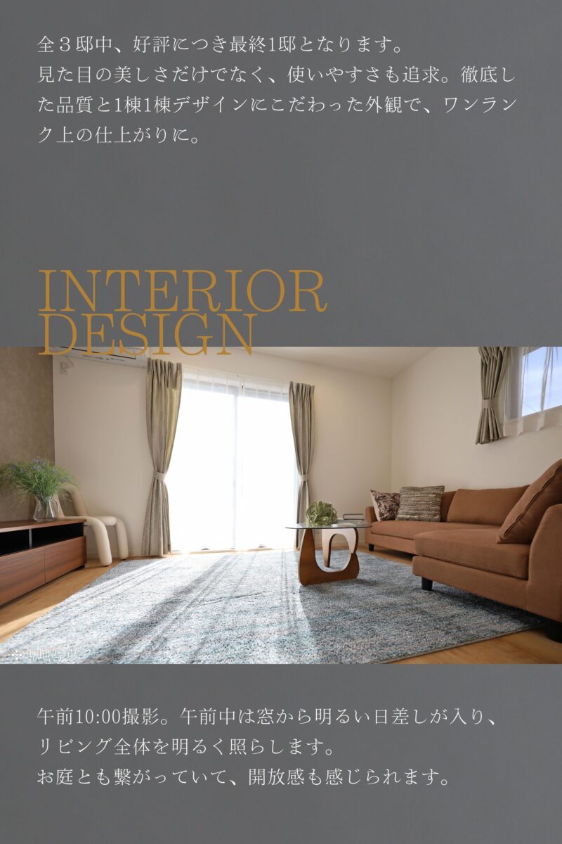 | 設備仕様 | 上水道 下水道 電気 都市ガス TVモニター付きインターフォン 人感センサー付照明(玄関、廊下) 玄関電子キー 食器洗い乾燥機 浄水器 浴室換気乾燥機 ホスクリーン(室内物干し) ウォークインクロゼット 床下収納 土間収納 カーテン 照明 網戸 |