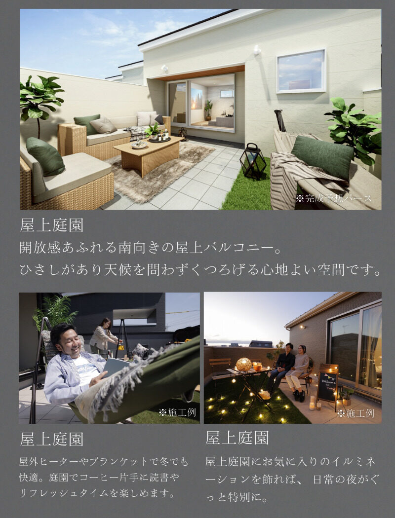 設備仕様 上水道 下水道 電気 都市ガス TVモニター付きインターフォン 人感センサー付照明(玄関、廊下) 玄関電子キー 食器洗い乾燥機 浄水器 浴室換気乾燥機 ホスクリーン(室内物干し) ウォークインクロゼット 屋上庭園 床下収納 カーテン 照明 網戸