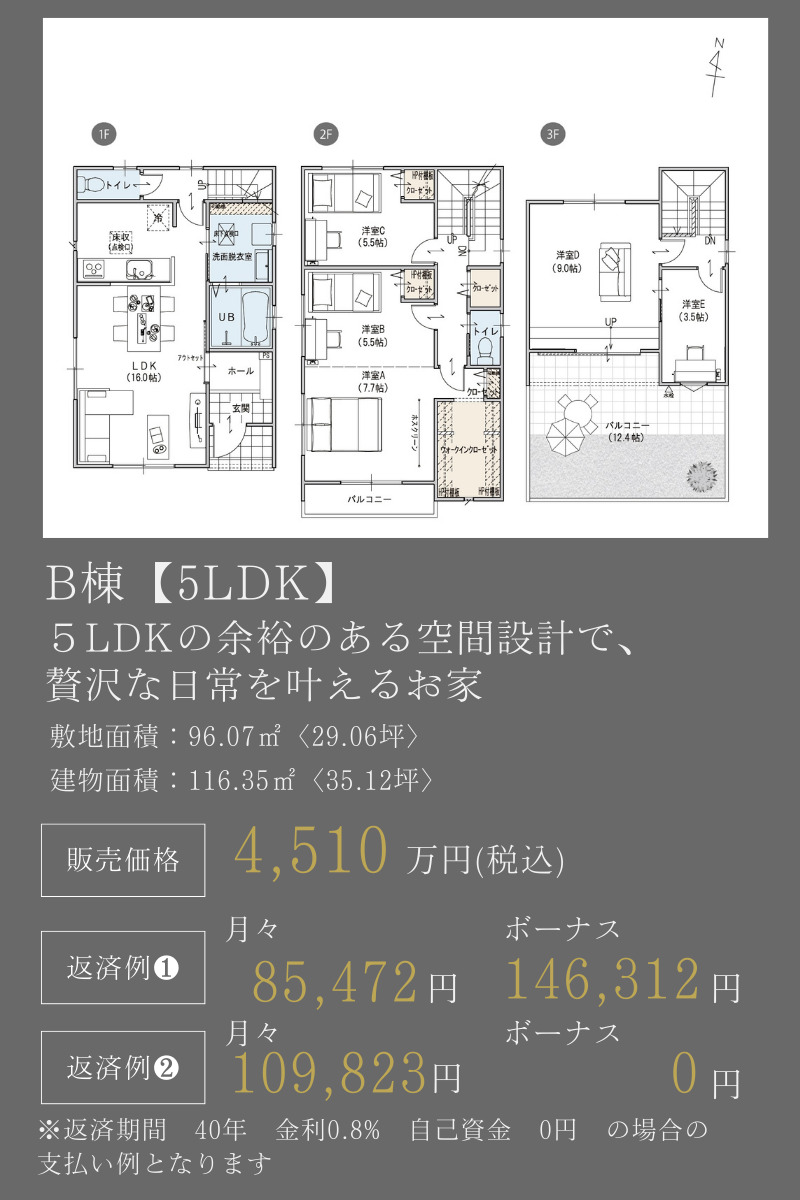 土地面積 95.42m²(28.86坪) 〜107.55m²(32.53坪)建物面積 112.94m²(34.10坪) 〜117.28m²(35.41坪)